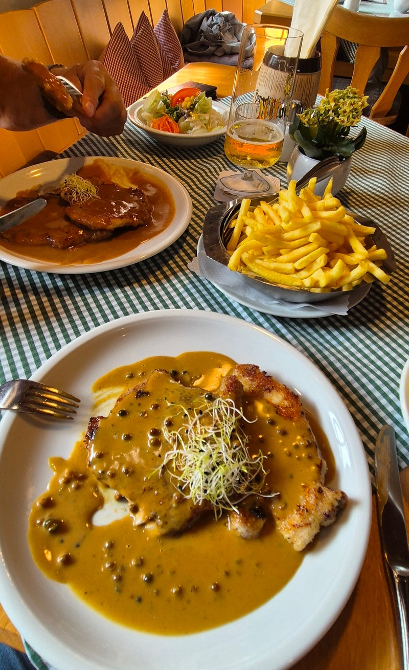 Hier hebben we een broodje met Duitse worst gekocht en een stevige pul bier.