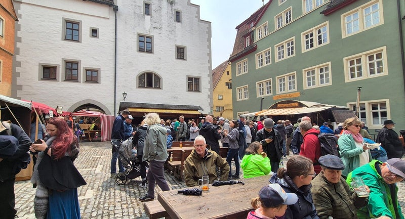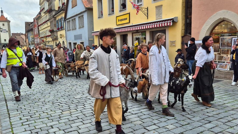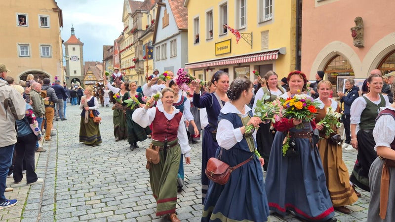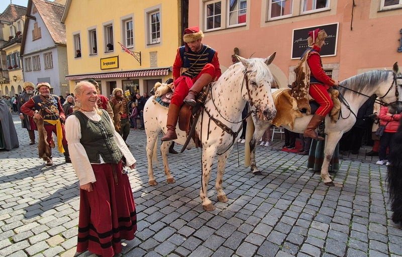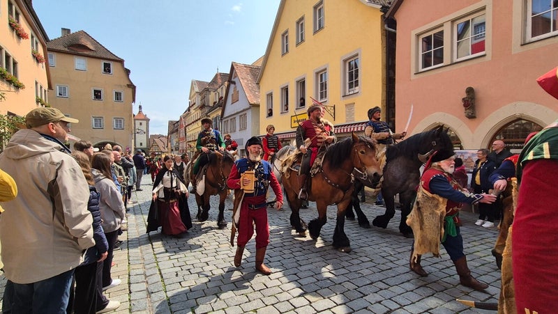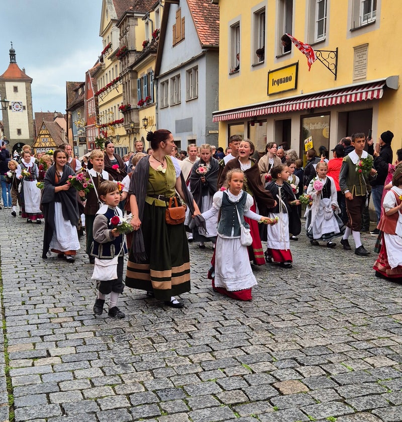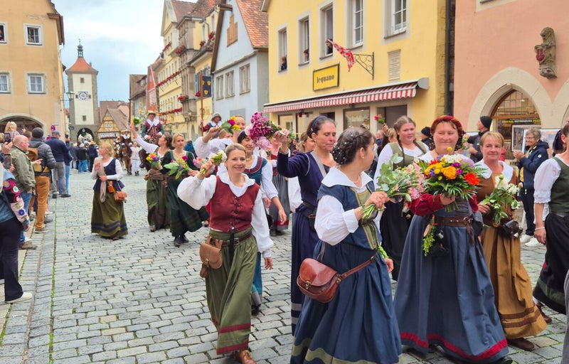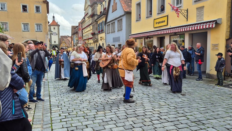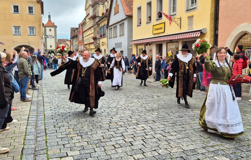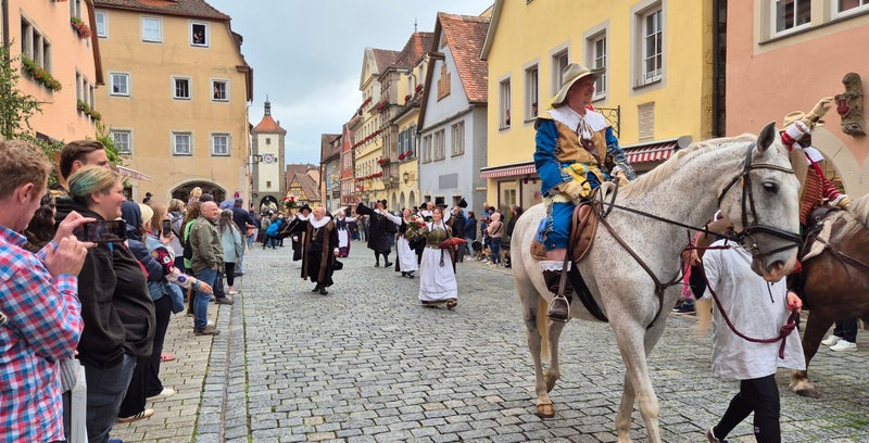 Toen de ergste buien voorbij waren, pakten we onze paraplu’s en besloten Rothenburg ob der Tauber te bezoeken. Dit weekend word hier het jaarlijkse festival gevierd, een indrukwekkend evenement dat draait om het historische toneelstuk, waarin de dramatische gebeurtenissen van 1631 tijdens de Dertigjarige Oorlog worden nagespeeld. Destijds bevond Rothenburg zich in een moeilijke positie: als rijksstad was het officieel trouw aan de katholieke keizer Ferdinand II, maar tegelijkertijd sympathiseerde het met de protestantse Zweedse koning Gustav II Adolf.