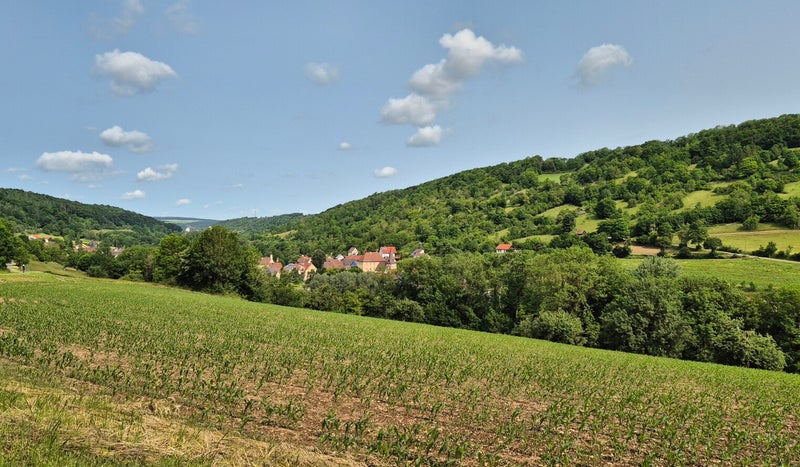 Bij Creglingen, het keerpunt van onze route, werd het echte werk zichtbaar: een stevige klim van 277 meter naar een hoogte van 479 meter.