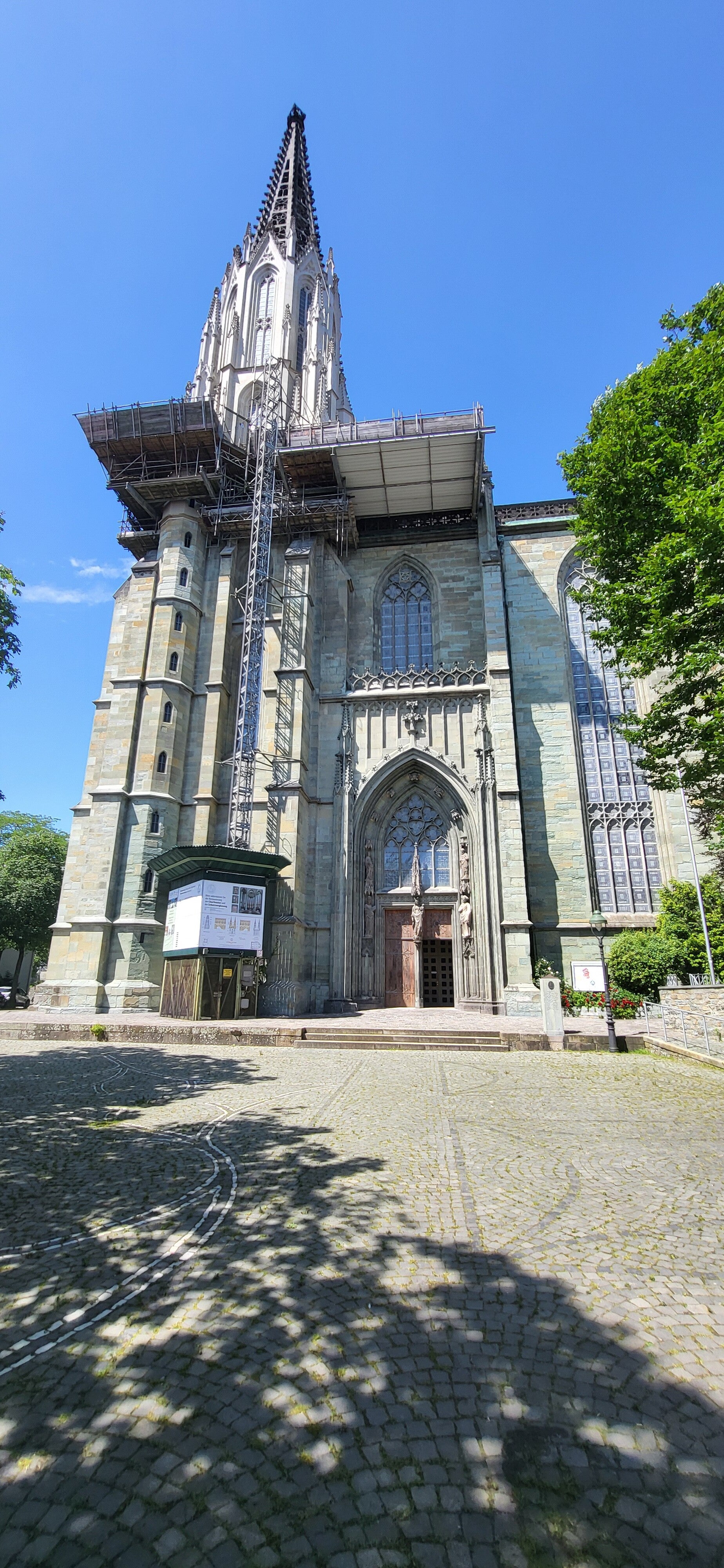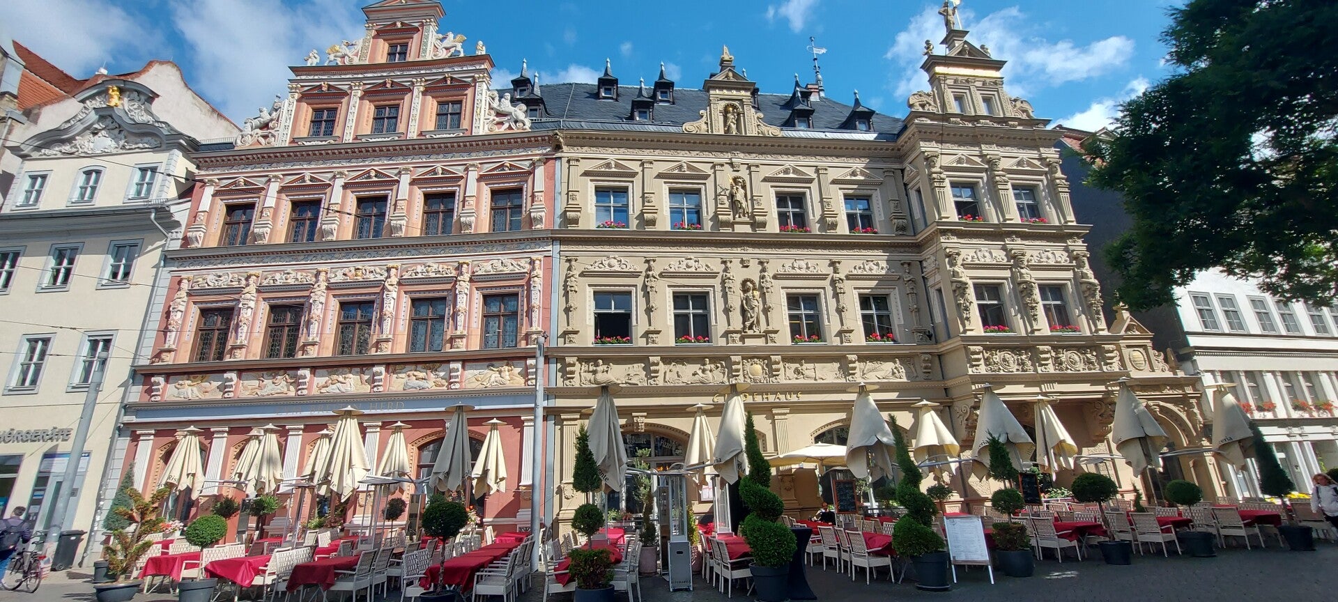 Vervolgens wandelden we langs het Raadhuis naar de Domplatz, waar twee indrukwekkende gebouwen het plein domineren. De Dom St. Marien, oorspronkelijk een romaanse basiliek uit 1154, staat op een heuvel waar vroeger de citadel lag. In de 14e eeuw werd de kerk uitgebreid met een hoog gotisch koor en een noordportaal. Later werd het romaanse schip vervangen door een flamboyant-gotisch schip met brede zijbeuken. Naast de Dom bevindt zich de Severikirche, een voormalige kloosterkerk van St. Paulus. Deze vijfbeukige vroeggotische kerk herbergt in de zuidelijke zijbeuk de sarcofaag van St. Severus, bisschop van Ravenna.