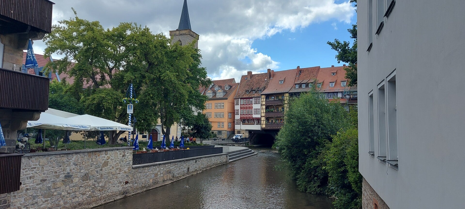 De Krämerbrücke, ook wel bekend als de Kruideniersbrug, dateert uit 1325. Het is een unieke brug met aan beide zijden bewoonde huizen. In de middeleeuwen waren dit er 62; tegenwoordig zijn er nog 32 over. Tussen deze huizen loopt een smal straatje waar ambachtslieden hun ateliers hebben. Overal hangen kleurrijke lijnen met gevouwen vogeltjes als decoratie, wat de sfeer extra bijzonder maakt.