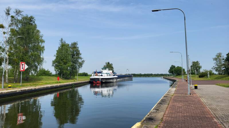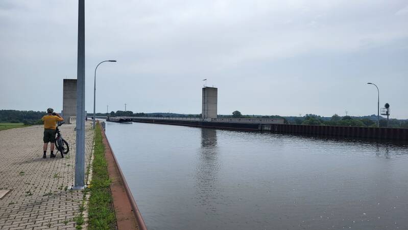 We volgden het kanaal en kwamen uit bij de indrukwekkende stalen trogbrug, die met zijn 918 meter de langste kanaalbrug van Europa is. Deze brug leidt het Mittellandkanaal over de rivier de Elbe.