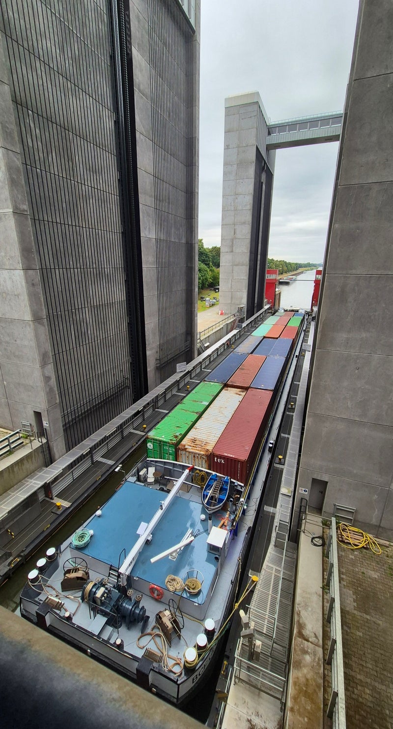 We blijven vandaag nog een dagje staan en nemen de tijd om het Schiffshebewerk te bekijken. Dit indrukwekkende bouwwerk in Scharnebeck, vlakbij Lüneburg in Nedersaksen, is een van de grootste scheepsliften ter wereld. Het werd voltooid in 1974 en overbrugt een hoogteverschil van maximaal 38 meter tussen het boven- en beneden water van het Elbe-Seitenkanaal. De lift bestaat uit twee onafhankelijke troggen van ieder 100 meter lang, die de schepen in slechts 15 tot 20 minuten omhoog en omlaag tillen fascinerend om te zien. Daarna zijn we naar het bezoekerscentrum gewandeld, dat gratis toegankelijk is. Hier konden we modellen en informatieve panelen bekijken die de werking en geschiedenis van zowel het Schiffshebe werk als het Elbe-Seitenkanaal mooi uitleggen. Na ons bezoek hebben we nog wat boodschappen gedaan. Van verdere plannen kwam weinig terecht, want de regen kwam letterlijk met bakken uit de hemel vallen een prima moment om gewoon even rustig aan te doen.