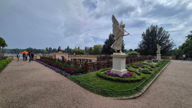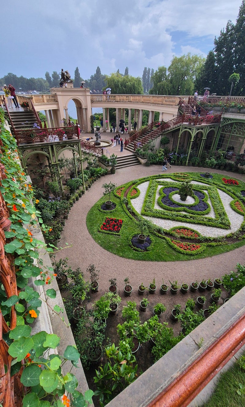 Deze tuinen, ontworpen in de 19e eeuw door landschapsarchitect Peter Joseph Lenné, zijn strak vormgegeven in barokke stijl met geschoren hagen, lange lanen, fonteinen en een centrale vijver. Een plek die rust en elegantie uitstraalt, zelfs met een paraplu in de hand. Na het bezoek zijn we teruggelopen naar de camper, een tocht van zo’n twee kilometer. ’s Avonds hebben we in het restaurant op de camperplaats pizza gegeten. Die van mij was lekker, maar Jorrit had helaas een wat droge variant jammer. s`Middags nog veel regen gehad.