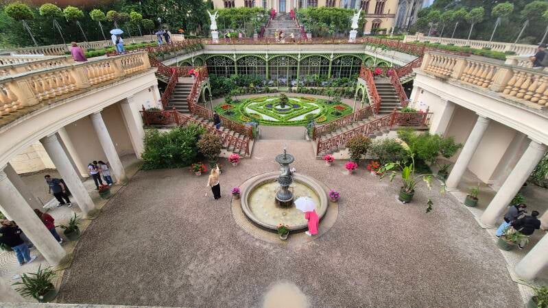 Wel zijn we ondanks de stromende regen rondom het kasteel door de prachtig aangelegde tuinen gelopen.