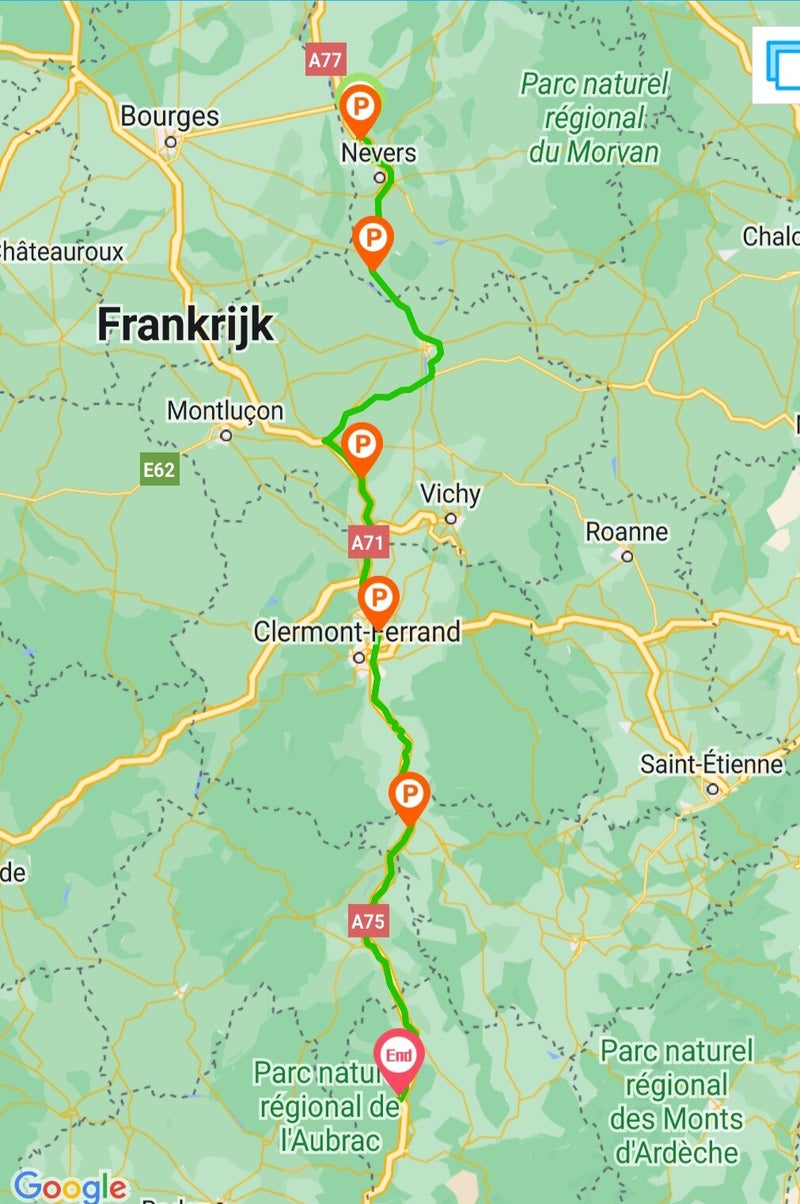 Hierna hebben we de A77 genomen een 4 baans weg waar we een overnachtings plek hebben gevonden op een Aire municipale in Paugues Les Eaux CC 10304 bij een sport complex en een Casino. Kosten €0,00 Morgen de wc legen en drink water tanken.