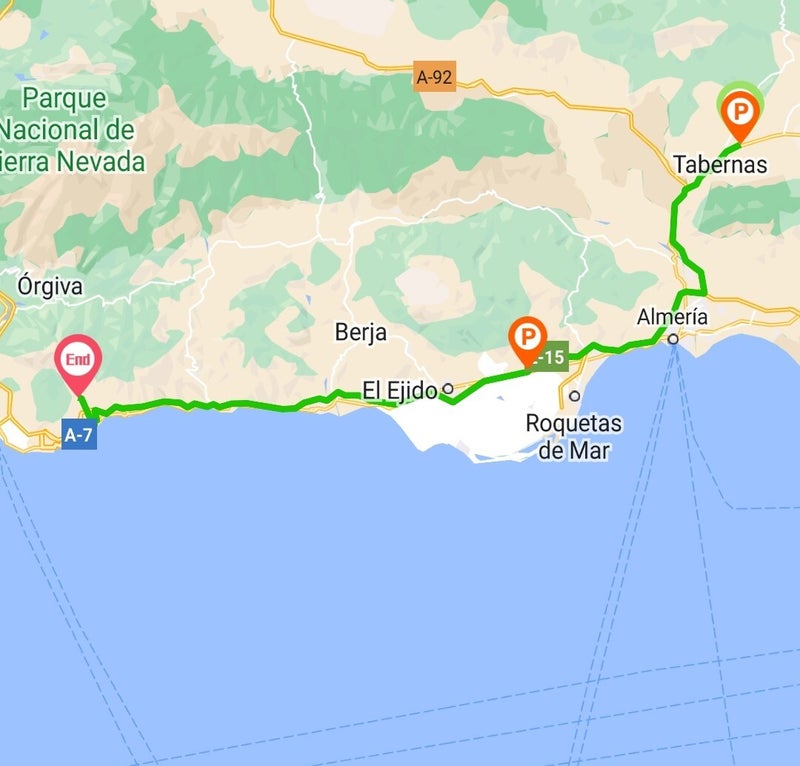 Vandaag maakten we een korte rit naar Almería. Onze eerste stop was de camperplaats net over de brug, maar omdat deze vol was, zijn we doorgereden naar camperplaats Parking Punta del Río (CC75329), waar nog enkele plekken vrij waren. Op deze parkeerplaats staan diverse caravans waarin Spanjaarden permanent wonen.