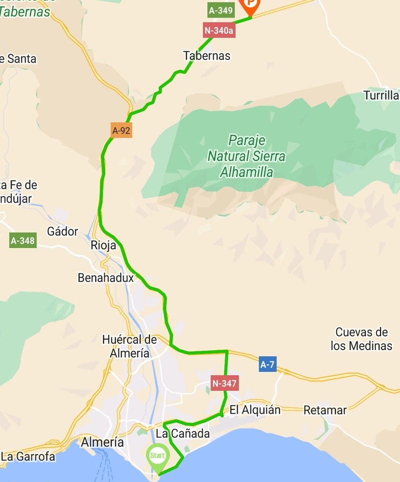 De route begint tussen de bekende plastic kassen, waarna het landschap langzaam verandert in een droge, maar indrukwekkende omgeving vol bloeiende agaves.