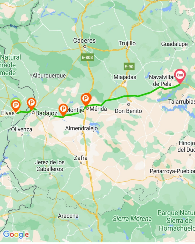 Vandaag begon met een bewolkte lucht. Al vroeg vertrokken we richting Spanje, via de A5 richting Badajoz.