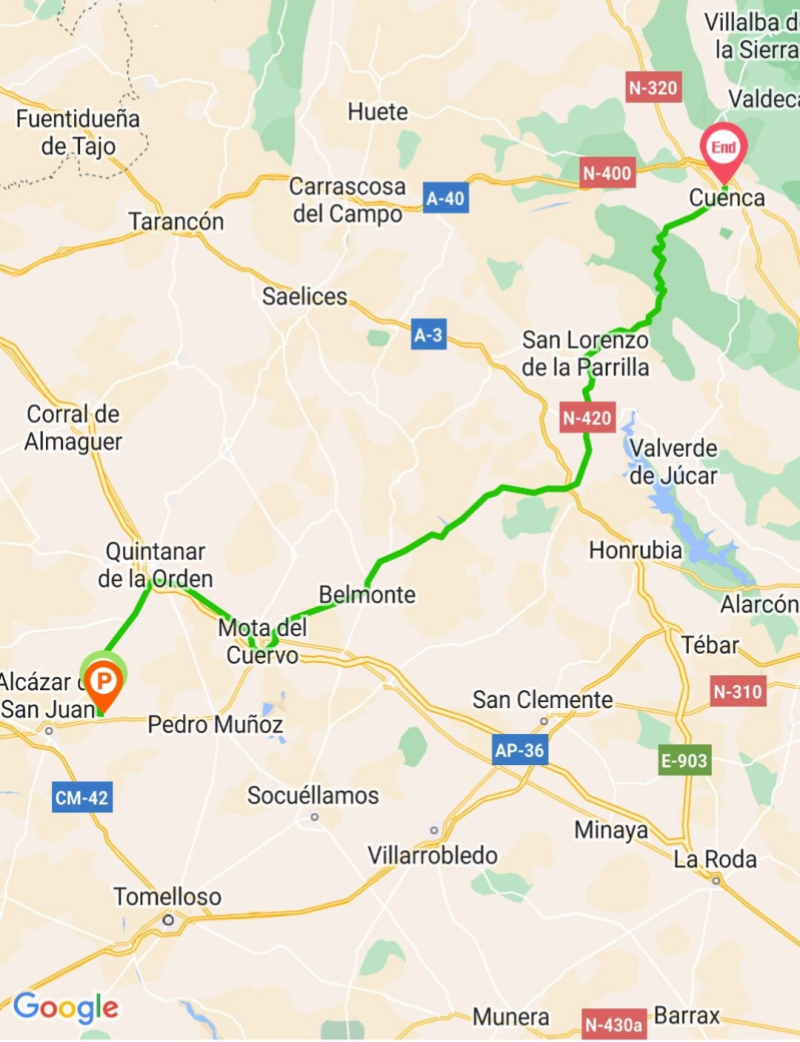 Bij Torrefresneda verlieten we de A5 en vervolgden onze weg over de N430, een prachtige route. Het eerste gedeelte van de rit leidde ons door een agrarisch gebied, met uitgestrekte amandelbomen die volop in bloei stonden. Deze werden afgewisseld met olijfbomen en natte velden waar rijst wordt verbouwd.