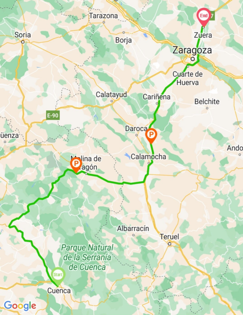Deze dag vroeg vertrokken richting Zaragoza via de N320, een mooie weg met mooie groene heuvels en veel roze bloeiende amandel bloesem.