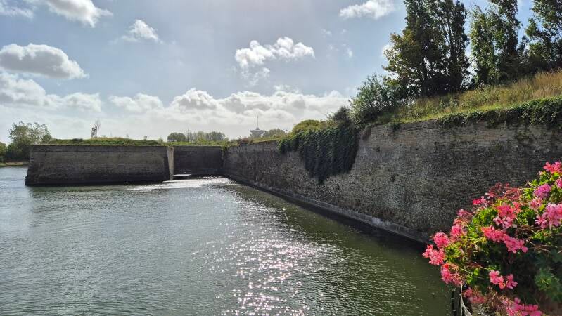 Bij aankomst was het eb en lagen alle bootjes vredig in de modder, een bijzonder gezicht. Nadat we de camper waterpas hadden gezet en genoten van een kop koffie, besloten we een wandeling te maken rondom de beroemde Vauban-vestingwerken.