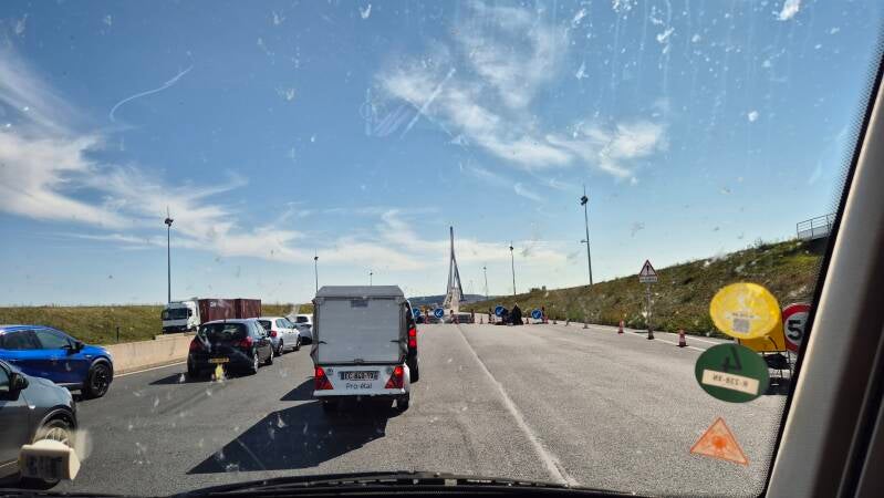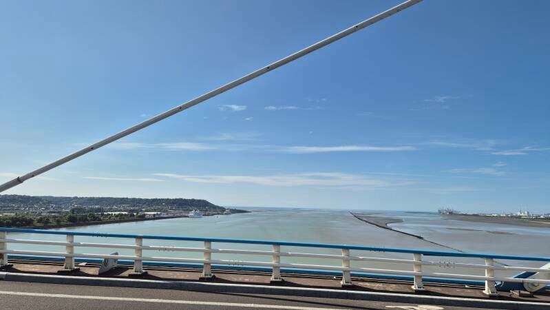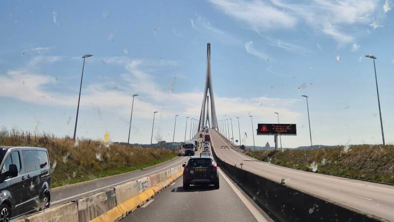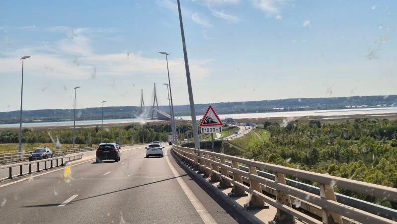 Bij de Pont de Normandie werden we geconfronteerd met druk verkeer. Er waren werkzaamheden aan de brug, waardoor we over slechts één rijbaan omhoog moesten rijden.