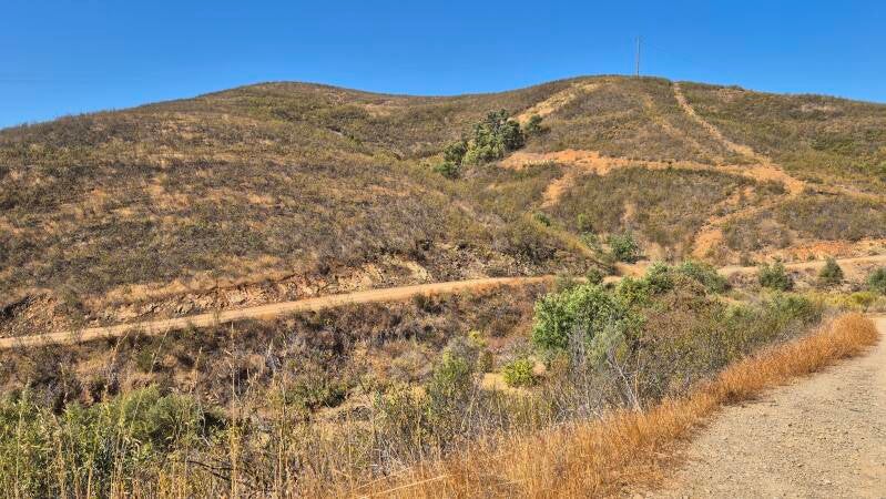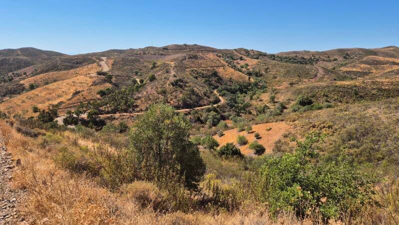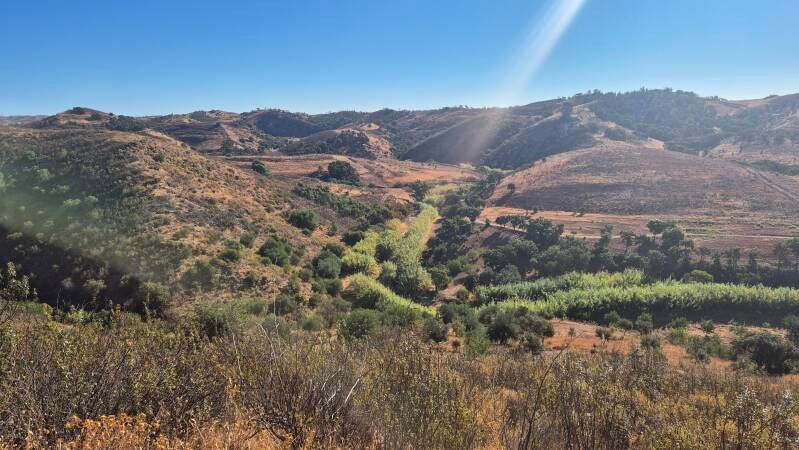 De route voerde langs de Barragem da Malhada do Peres, maar daar hebben we niet veel van gezien. De weg die daarheen leidde was erg hobbelig en steil, dus hebben we ervoor gekozen om door te fietsen.