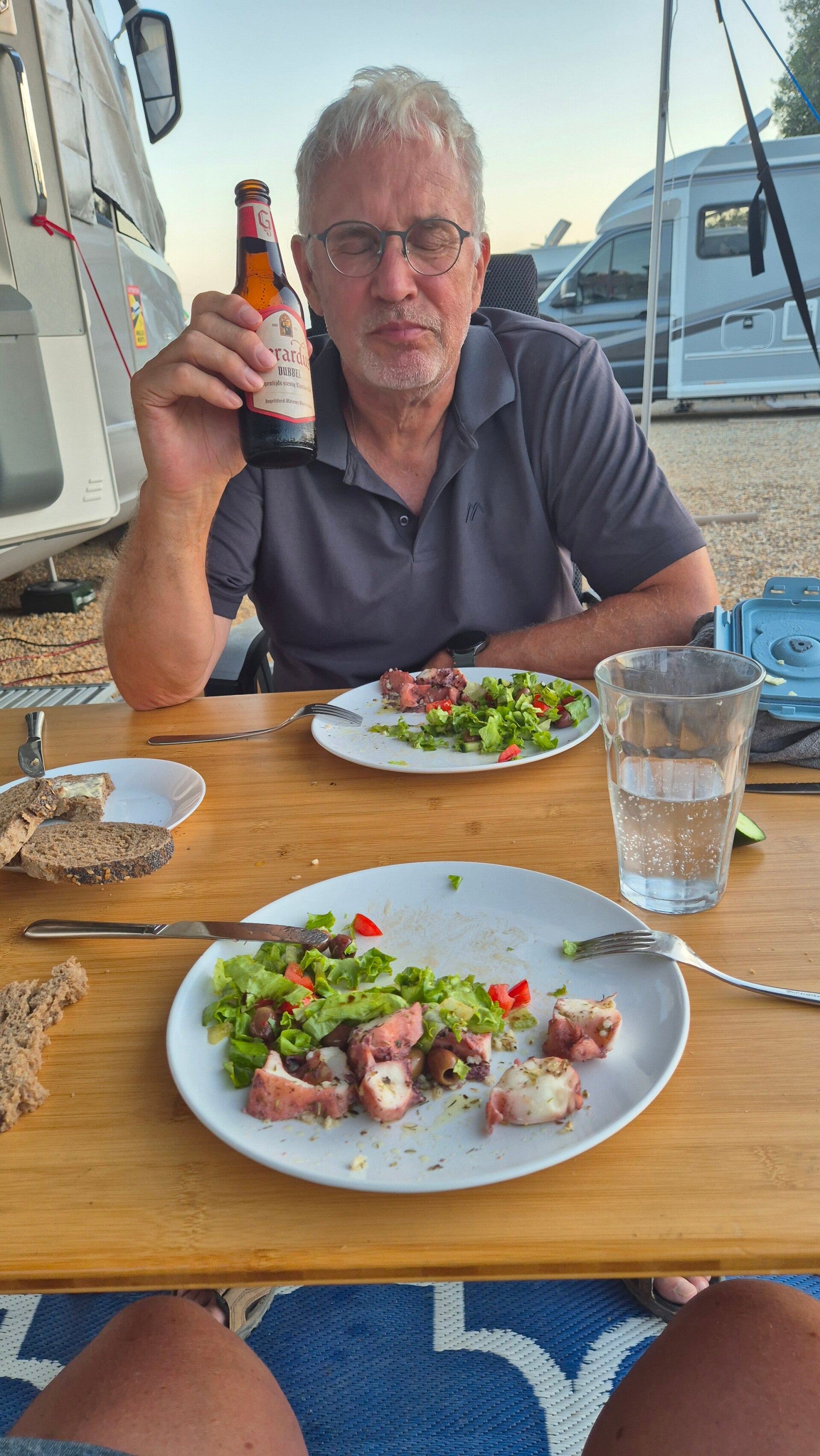 In de middag ging Jorrit nog boodschappen doen bij de Continente. Hij kwam thuis met een interessante vondst: inktvistentakels. Na wat speurwerk naar een recept op internet hebben we ze klaargemaakt. Eerst kookten we de tentakels een uur zachtjes in ruim water met peper, citroensap, knoflook, zout en Provençaalse kruiden, zodat ze lekker mals werden. Vervolgens sneden we de tentakels in stukjes en mengden ze met een marinade van olijfolie, citroensap, geraspte knoflook en verse groene kruiden. Geserveerd met een salade en brood was dit een maaltijd die zeker voor herhaling vatbaar is.