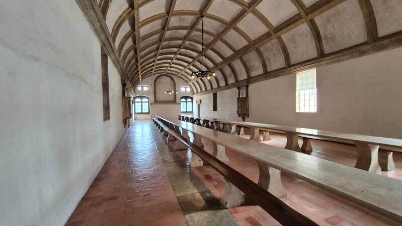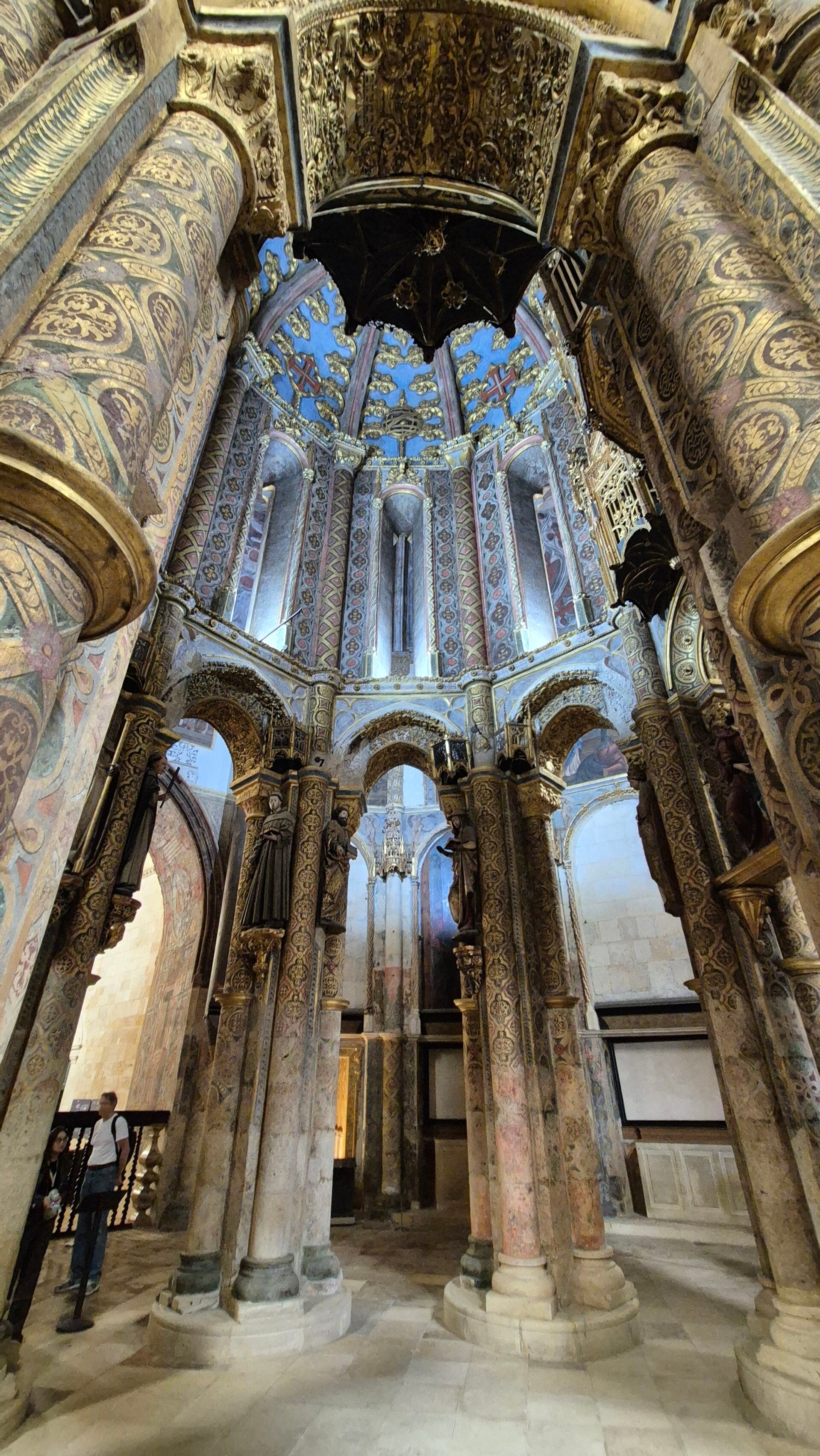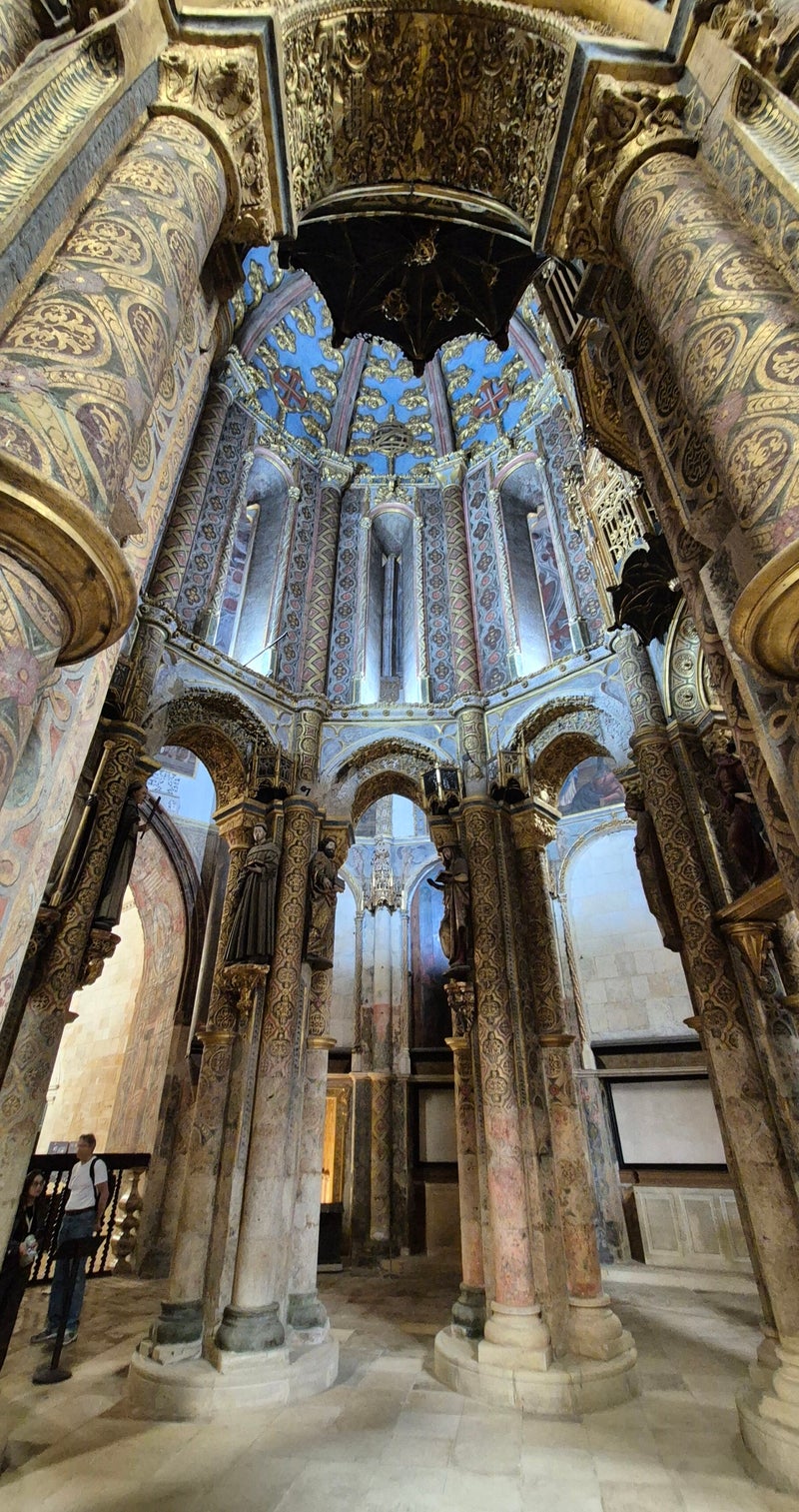 Na een stevige klim in de broeierige hitte komen we aan bij het indrukwekkende Convento de Cristo, opgericht in 1160 door de Orde van de Tempeliers. Na de ontbinding van de orde in 1314 werd het complex overgedragen aan de Orde van Christus, die een cruciale rol speelde tijdens de Portugese ontdekkingsreizen. Het complex is een fascinerende mix van architecturale stijlen, waaronder Romaanse, Gotische, Manuelijnse, Renaissance en Barokke elementen, samengebracht over een periode van zeven eeuwen. De Charola, de oorspronkelijke tempelierskerk, valt op door zijn ronde vorm en weelderige decoraties, geïnspireerd door de Heilige Grafkerk in Jeruzalem. De Manuelijnse vensters, met als hoogtepunt het beroemde venster van de hoofdstukkenzaal, zijn ware meesterwerken van de laat-Gotische Portugese stijl. We begonnen onze ontdekkingstocht bij de tuinen en de ruïnes van het kasteel. Daarna liepen we richting de ingang van het klooster, waar we een toegangsprijs van €15,00 betaalden (per persoon als je geen pensionado bent). De serene kloostergangen, versierd met geglazuurde tegels, waren prachtig, maar de Charola, de tempelierskerk, was zonder twijfel het hoogtepunt van het bezoek. Na alles op ons gemak te hebben verkend, keerden we voldaan terug naar de camper.