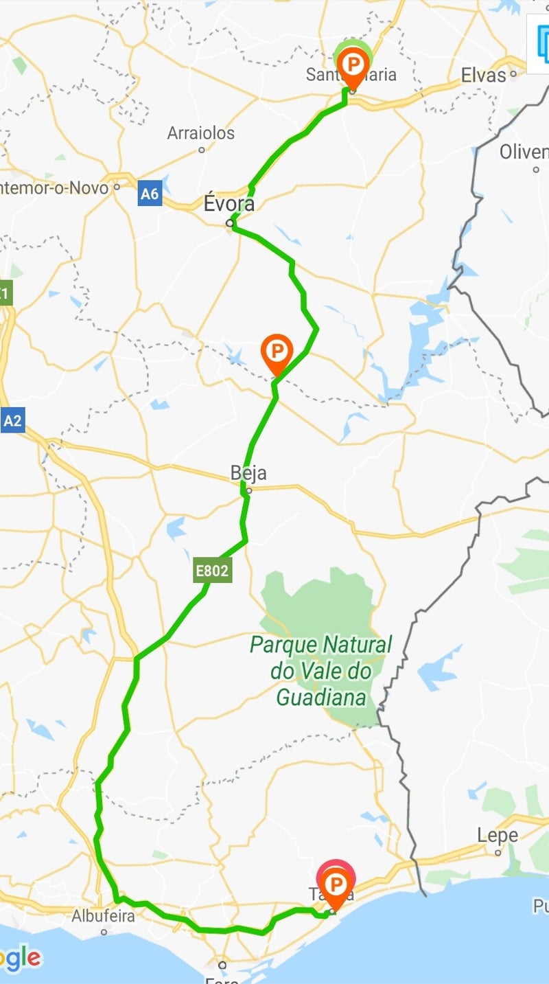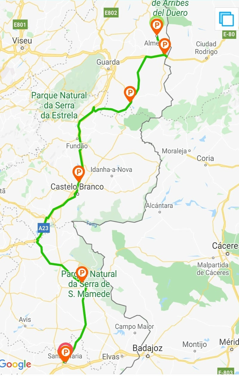 Via de A25 naar Sabugal en vandaar via de N233 en de E802 naar Santa Maria waar we midden op het marktplein een mooi plekje hebben gevonden. We beginnen het een beetje zat te worden, zijn al 6 dagen aan het rijden.
