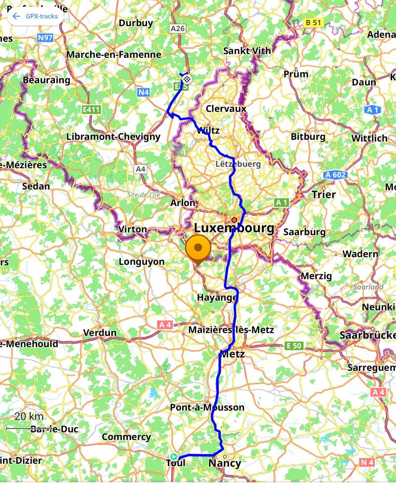 Vandaag wilden we naar Achouffe in Belgie rijden om daar een lekkere wandeling te maken en daar na afloop lekker te gaan eten bij de Forellen kwekerij. Vandaag hoofdzakelijk over snelwegen kunnen rijden door Frankrijk en Luxemburg. In Luxemburg nog goedkoop diesel kunnen tanken €148.1 p.ltr. en nog wat boodschappen en wijn gekocht. Bij Achouffe aangekomen stond alles vol met auto's wel jammer maar ja dat kun je verwachten met de Paasdsgen. Dus zijn we doorgereden naar Houffalize (CC 63646 N50.13215 E5.78814). Hier was nog plaats genoeg. We hebben hier 2 jaar geleden ook gestaan maar toen werd er midden in de nacht door de brandweer op de deur geklopt. We moesten gelijk weg want de Ourthe was buiten zijn oevers getreden en het water stond al op de camper plaats. In Valkenburg en op meer plaatsen in Nederland is het toen goed mis gegaan. We zijn na eerst een bakje koffie te hebben gedronken, Houffalize ingegaan om op een terras een lekker Achouffe biertje te gaan drinken. Later hebben we nog een plank met ham kaas pate enz.besteld, was erg lekker. De rest van de dag niet veel meer gedaan.