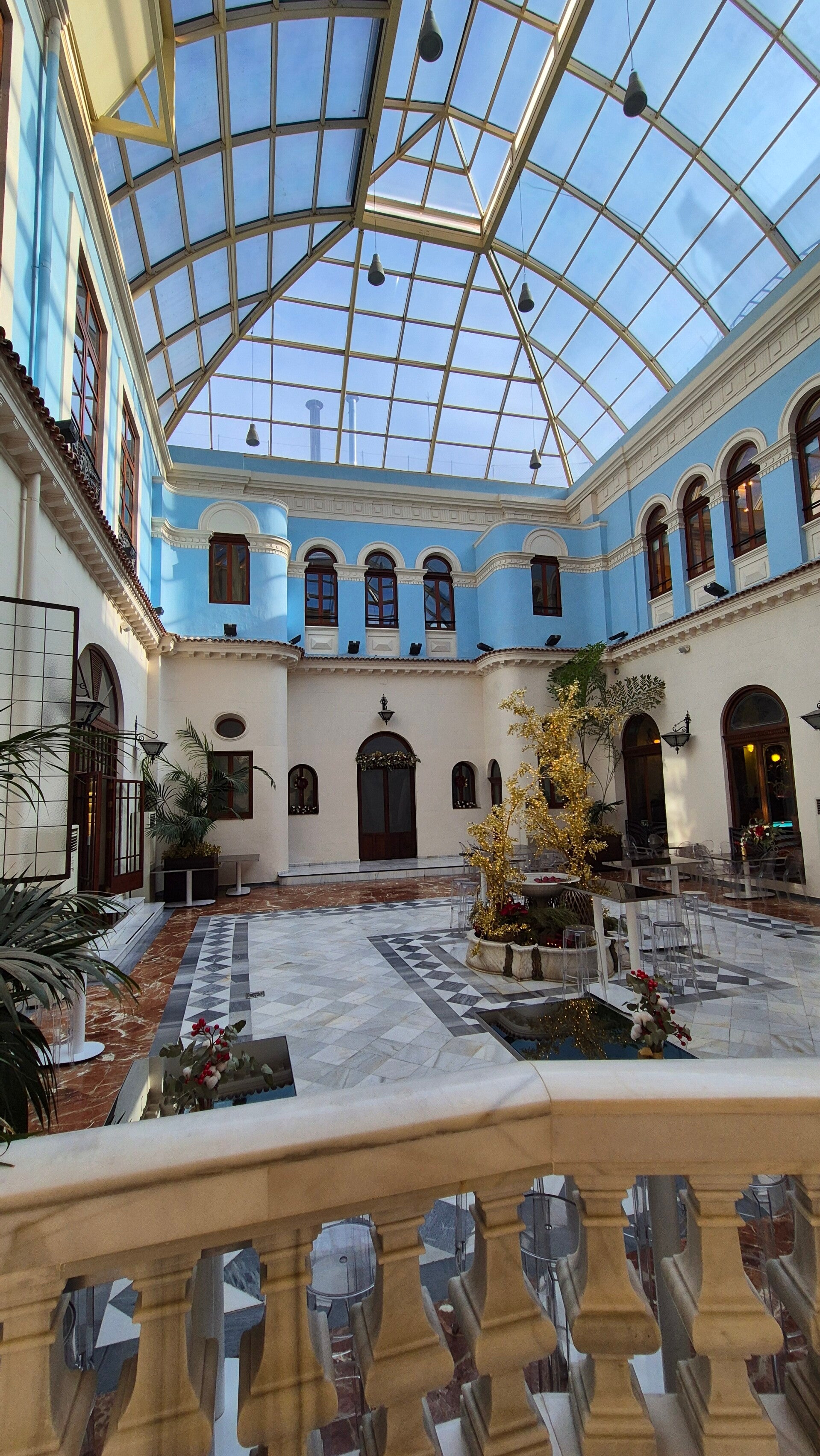 De binnenplaats is bedekt met een glazen koepel en de muren zijn in een uniforme kleur geverfd.